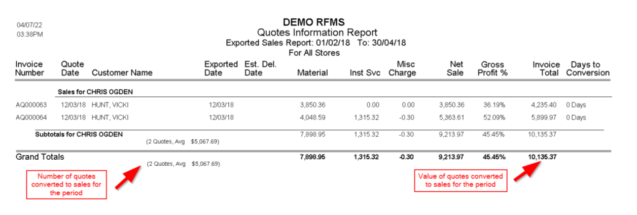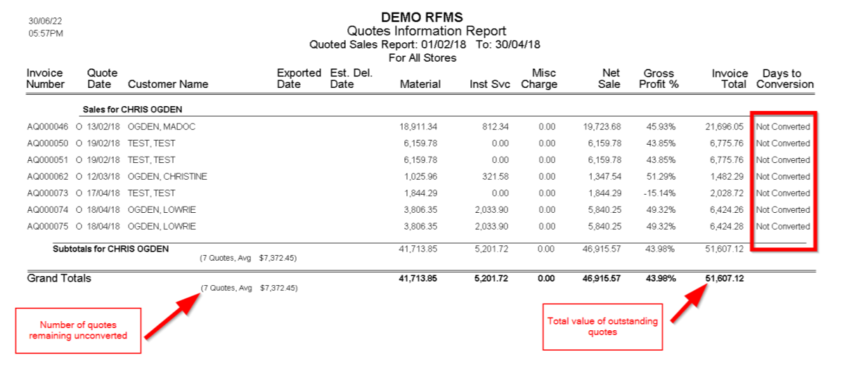 Note we don’t want our conversion rate to be skewed where multiple quotes have been generated for the same project. Salespeople should be using the Related Quote functionality to identify multiple quotes for a single project. For the purpose of the report, related quotes are not counted in either the quote numbers or the value of quotes. See this article at the RFMS Help Centre. (Contact us if you need a password to access the Knowledge Base).